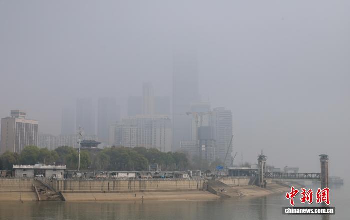 图为从汉阳北岸嘴花园看来,江对于岸的下楼覆盖正在雾气呼呼中。中新社记者 弛畅 摄